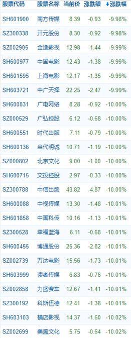 雪球网数据显示,文化传媒板块74只股票64只股票跌停收盘,包括万达电影、光线传媒、华策影视等龙头股在内,占比近90%,横店影视、幸福蓝海、金逸影视等院线股全部跌停。