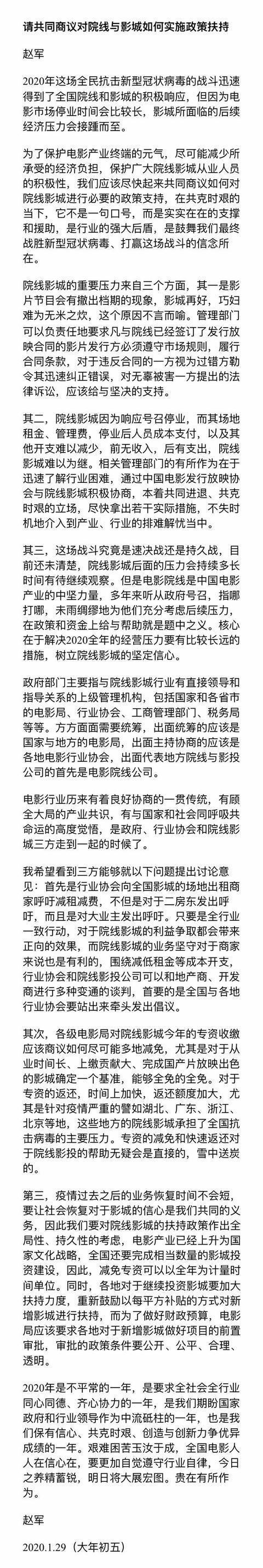 面对困境,院线正在积极发起自救。1月29日,原中国电影发行放映协会副会长、现上海唐德影院管理有限公司董事长赵军发布了一篇名为《请共同商议对院线与影城如何实施政策扶持》的倡议书。