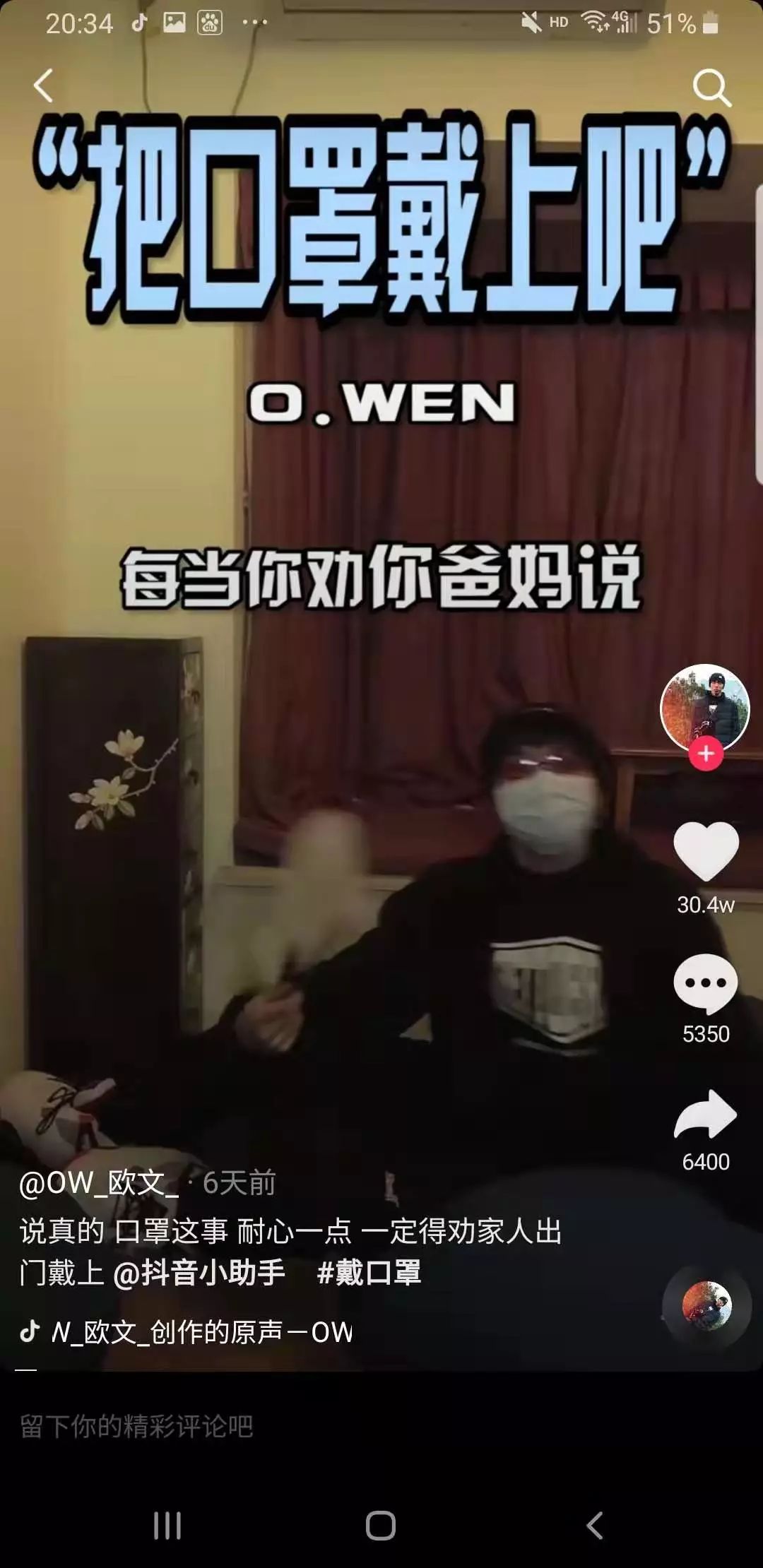 原来在家爱刷抖音的父母在这天继续刷短视频的时候,看到了视频博主都在强调戴口罩的重要性,这才肯戴上口罩,并且还开始号召邻居们也都要戴上口罩。