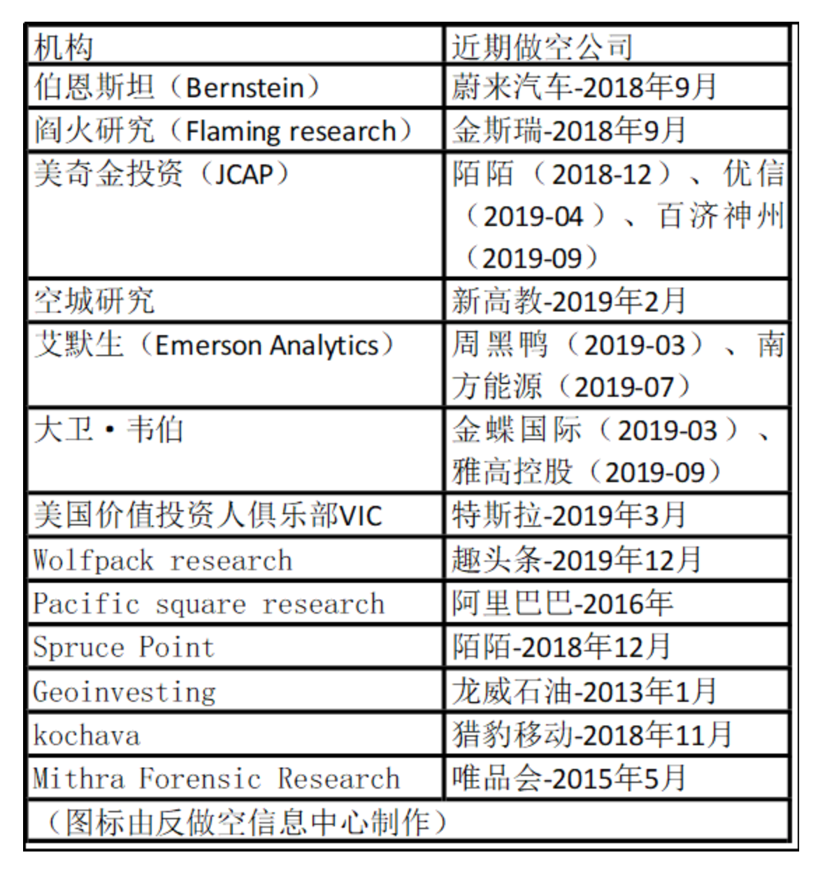 近些年来,做空中概股的机构越来越多,据反做空信息中心统计,伯恩斯坦(Bernstein)在2018年9月做空蔚来汽车、美奇金投资(JCAP)接连做空陌陌、优信和百济神州,Wolfpackresearch 2019年12月做空趣头条、kochava 2018年11月做空猎豹移动等等。