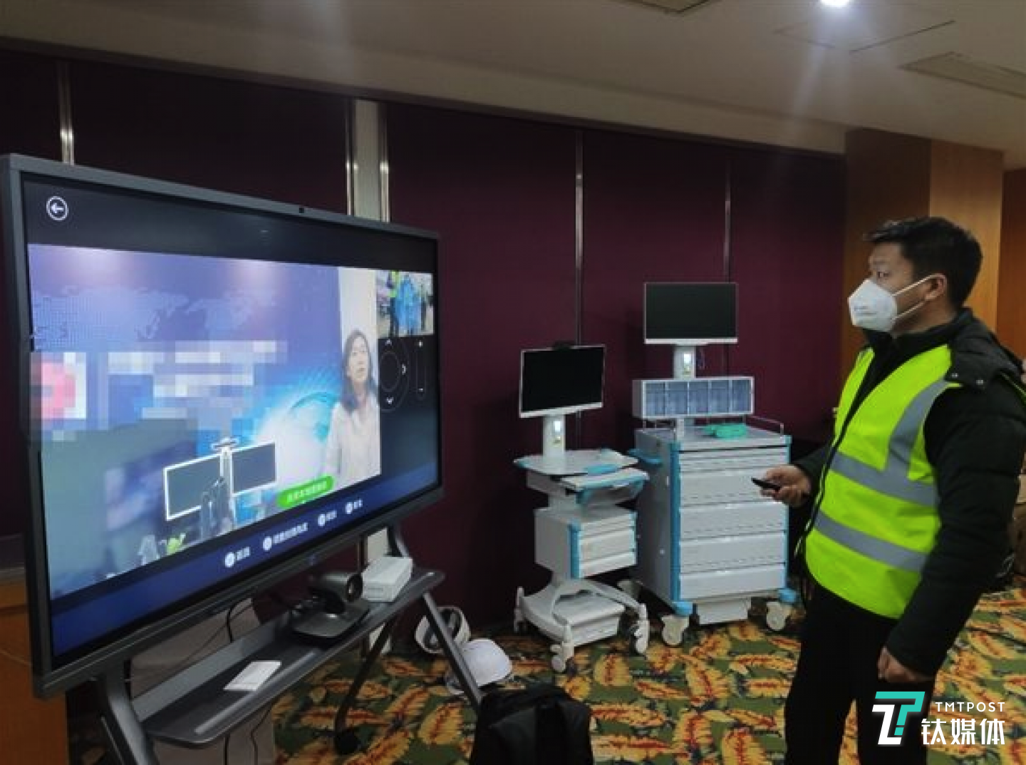 火神山医院还采购了配备有移动摄像头的医用推车,可进病房近距离拍摄病患情况。后期若有需要,推车拍摄的画面也可以引入远程会诊系统。