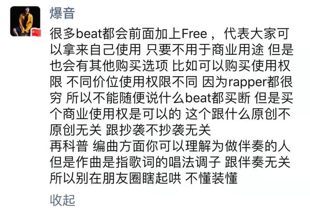 说唱歌手爆音也在朋友圈科普了作曲与编曲的区别,编曲是伴奏,作曲是旋律。