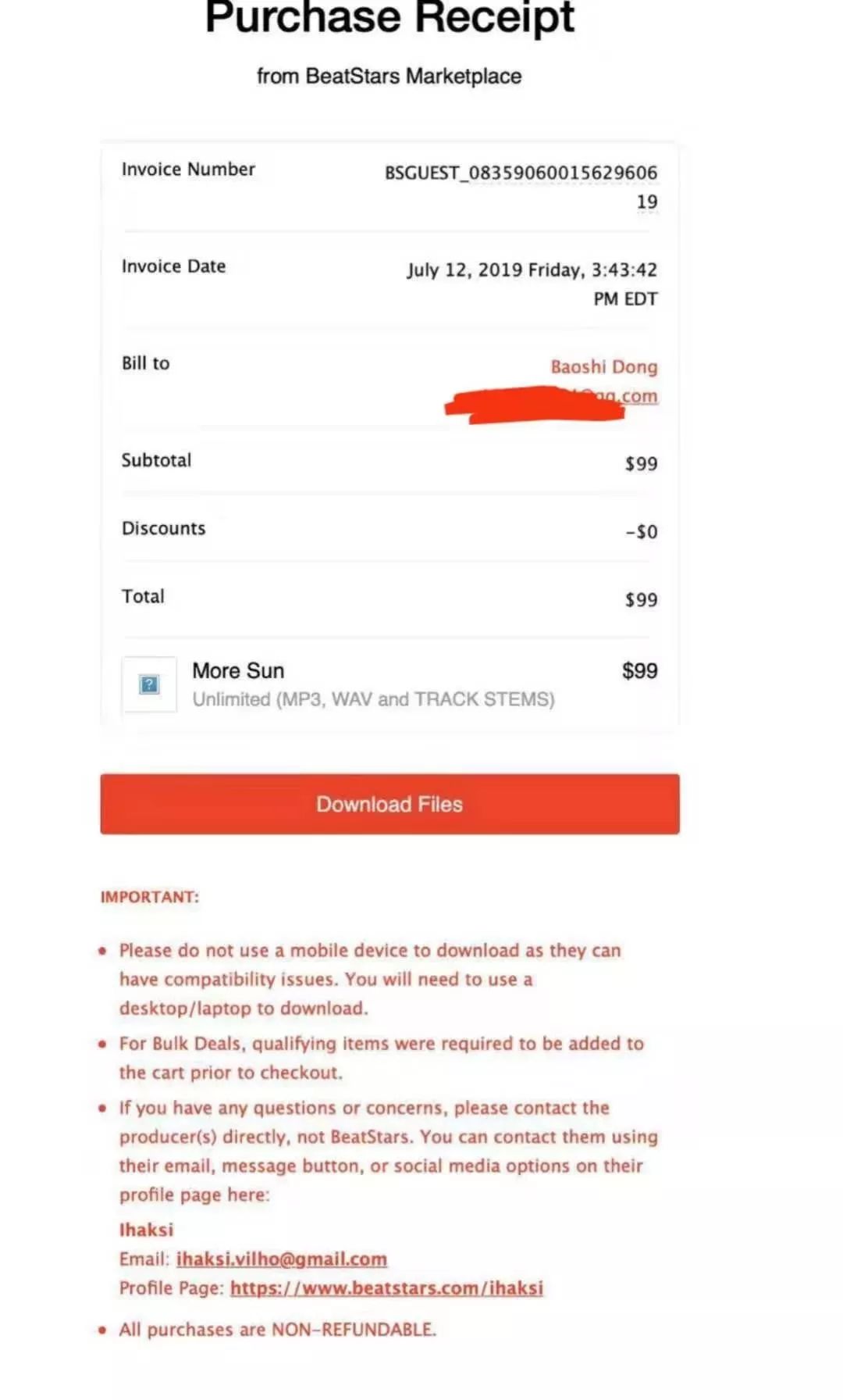 老舅经纪人告诉音乐先声,由于英文不太好,老舅委托自己在美国的朋友杨子昂去年7月在该网站购买了名为《More Sun》的Beat的99美元的Unlimited版本。同时,老舅经纪人也向音乐先声出示了当时的购买收据。