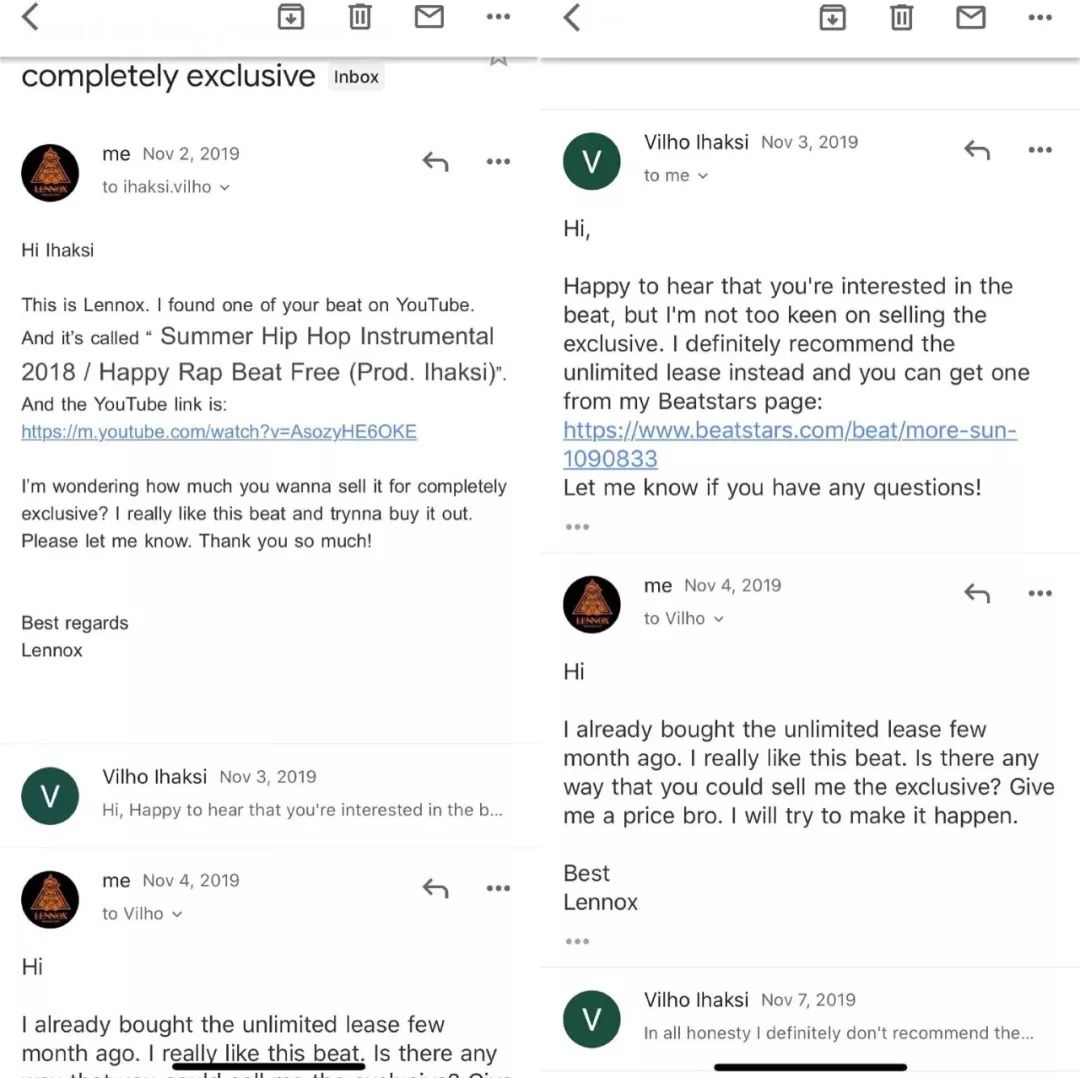 根据邮件内容我们可以得知,在11月2日,老舅在美国的朋友杨子昂给Ihaksi发送了第一封想要完全买断版权的邮件,但是该作者两次拒绝了其的要求,并称自己十分喜欢这首Beat,而且也已经卖出去很多无法撤回的许可了,如果有人想要买断这首Beat,他会要一个"疯狂的价格(crazy price)"。