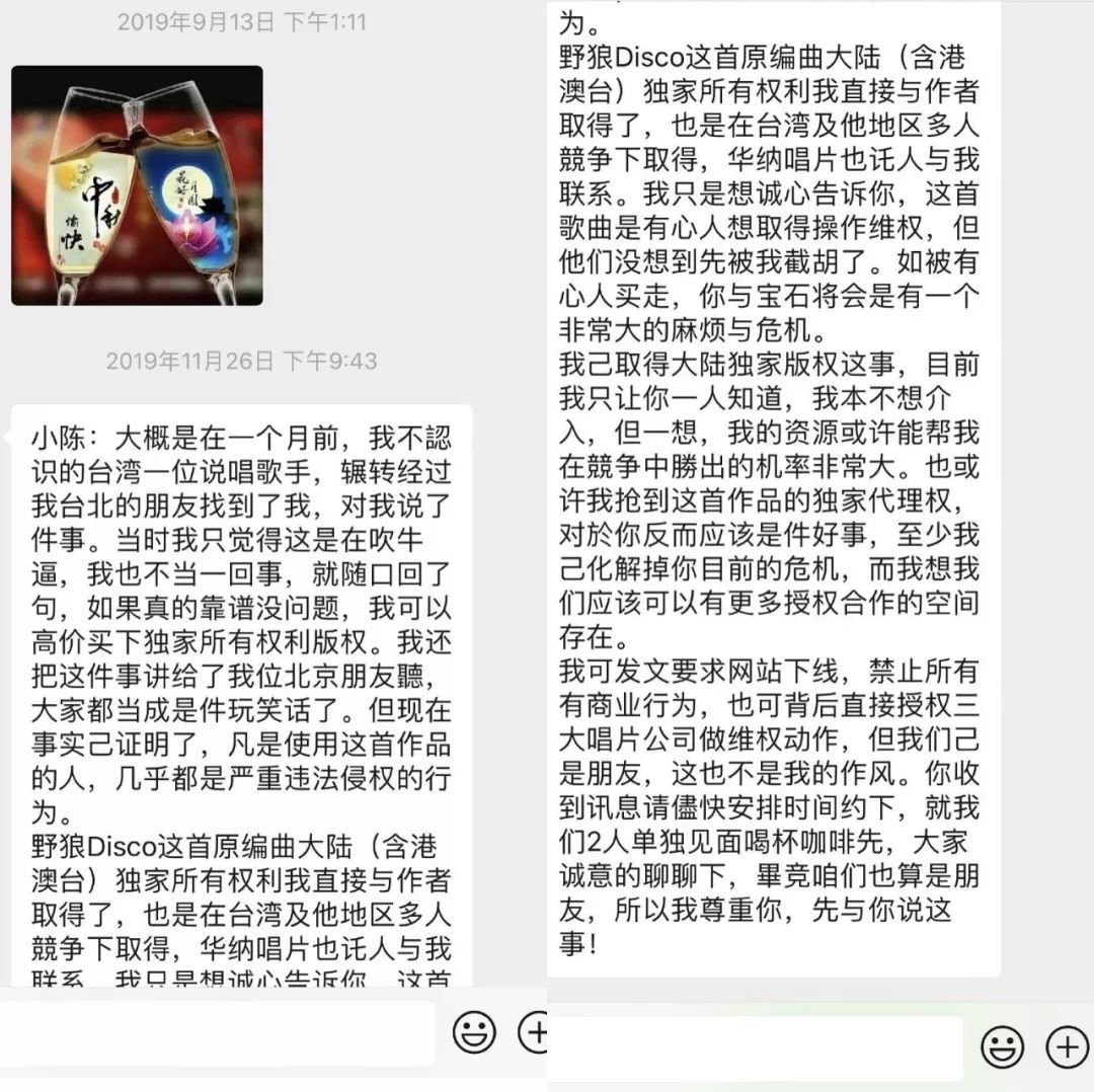 当晚8点零3分,老舅便在微博直播中拿出了自己的购买凭证和沟通邮件,其经纪人也晒出了自己与"维权方"交涉的微信记录。"宝石gem回应野狼disco涉侵权"也登上热搜前10,让事件出现反转。