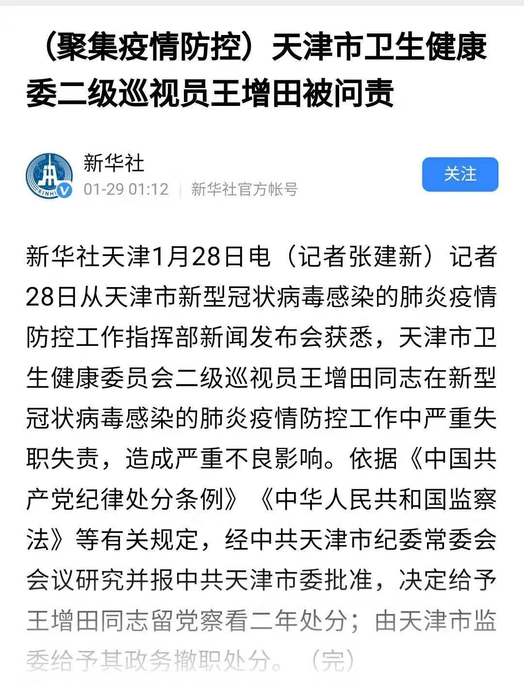 天津上下也直接感受到了战时机制下的“军令如山”。1月29日,天津市卫健委二级巡视员王增田因严重失职失责,被给予留党察看二年、政务撤职的处分。这应该是疫情爆发后,湖北之外处理官员最早、级别最高的案例之一。