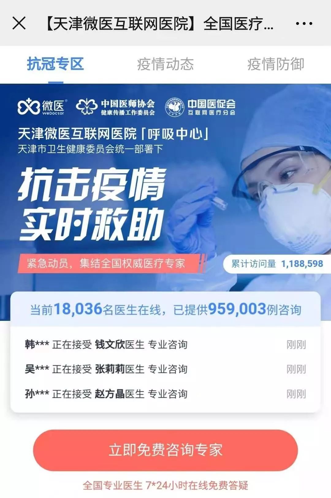 除夕之夜,天津市卫健委、医保局和网信办统一部署的 “微医互联网医院”火速上线。在线坐诊的,是来自全国各大医院的1500多位呼吸科、感染科专家和大夫。