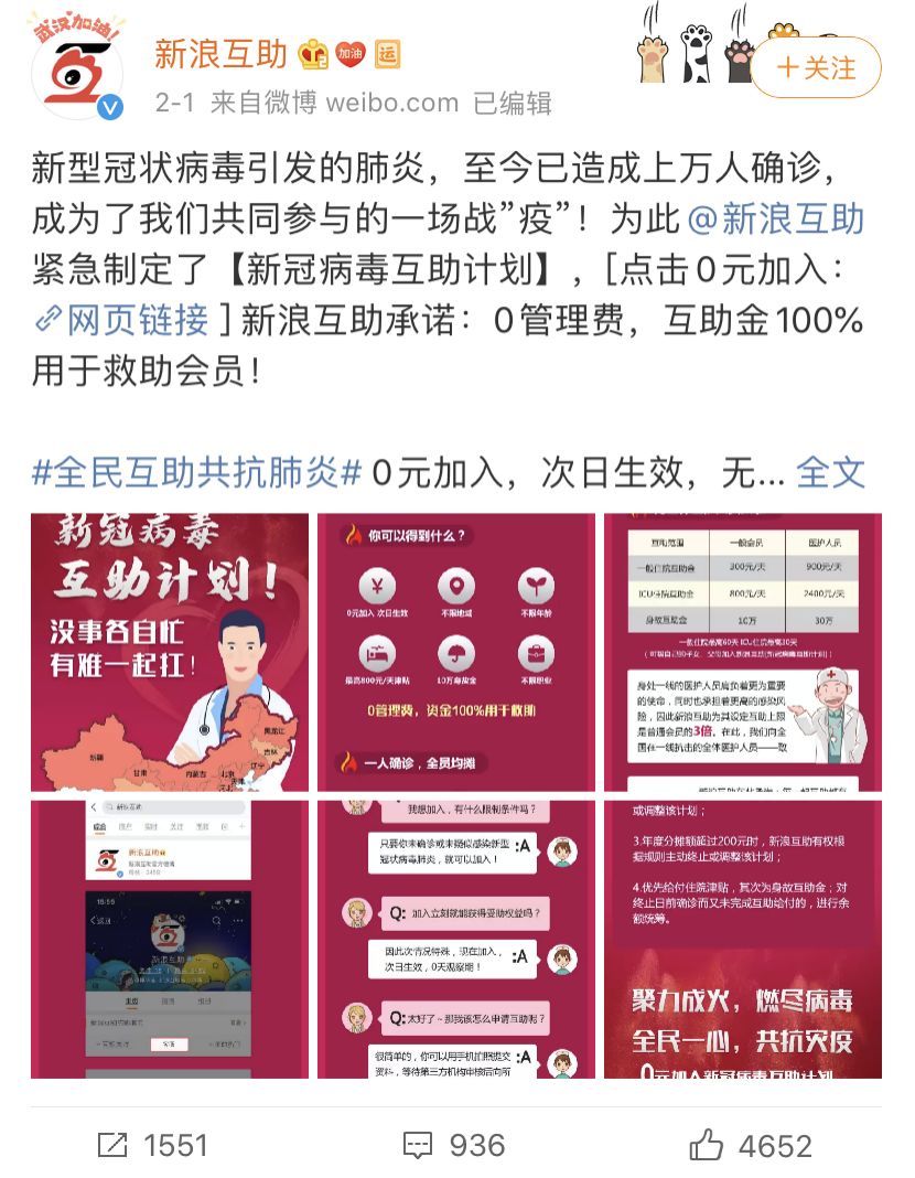 而360互助、相互宝、水滴、新浪互助等,也纷纷启动了与新型冠状病毒有关的互助计划。