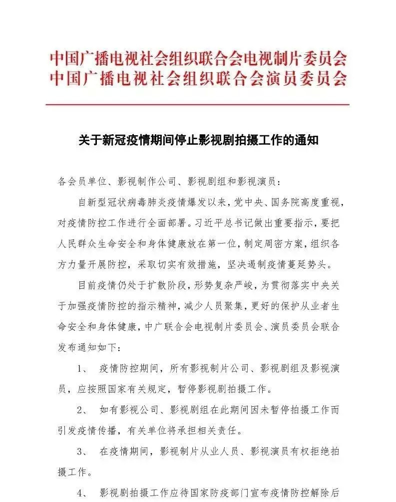 在1月27日横店影视城关闭景区并暂停剧组拍摄后,2月1日,中国广播电视社会组织联合会电视制片委员会、中国广播电视社会组织联合会演员委员会也联合发布了通知,要求在新型冠状病毒肺炎疫情防控期间,所有影视制片公司、影视剧组及影视演员,应按照国家有关规定暂停影视剧拍摄工作,并指出如有剧组继续开工造成了感染,相关方将承担责任。