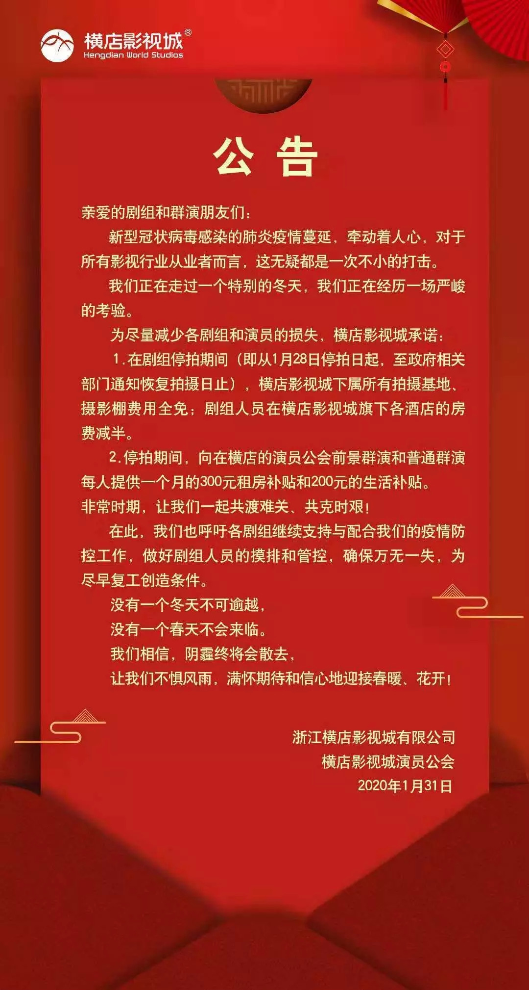 这一切要归功于2月1日横店影视城的新政策。2月1日,横店影视城微博发布公告,称为尽量减少各剧组和演员的损失,承诺在停拍期间,下属所有拍摄基地、摄影棚费用全免,剧组在旗下各酒店的费用减半。