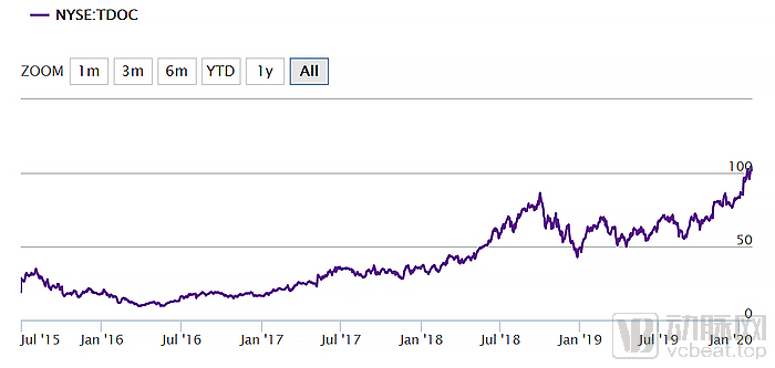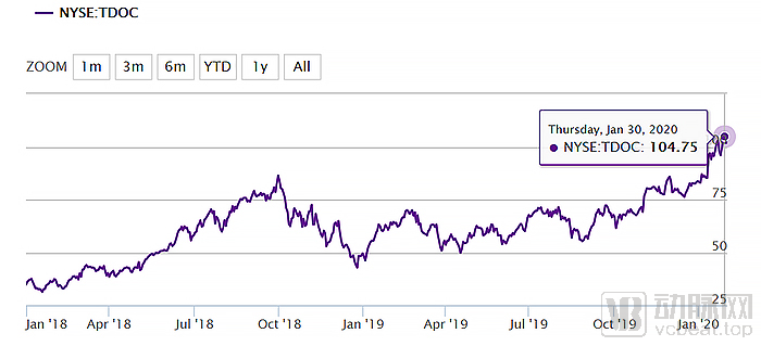 1月30日,Teladoc的收盘价进一步上涨,收盘价达到104.75美元,创造了历史最高纪录。截止本文截稿时最后一个交易日(美国东部时间2020年2月3日),Teladoc Health收盘价达到101.99美元。
