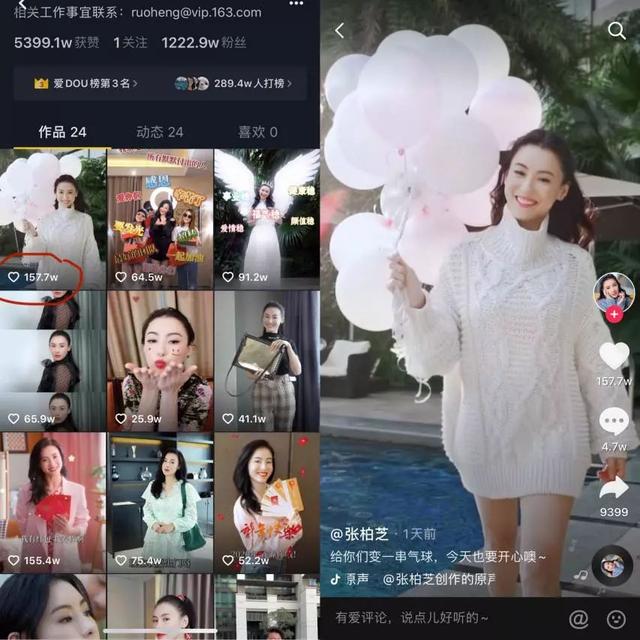 距离张柏芝11月15日开通微博过去仅仅两个多月, 发布27条短视频便吸粉1258万,获得点赞量为5830万,且粉丝量每日以万为单位在不断上升中,进入明星爱DOU榜高位。6条视频发布后,张柏芝的抖音账号便发布了一条与某美妆品牌的合作视频,23条视频中,有5条都是品牌合作相关。