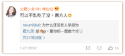 “这些评论的内容,都是引导网友往负面去联想。”相关法律人士指出,其他用户即便向官方投诉、举报该用户内容违规,官方往往也很难界定该言论存在着违法、违规的行为,“都是在玩文字游戏,引导其他用户去咒骂或者反击。”