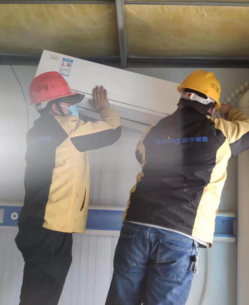 由于项目特殊且紧急,雷神山医院的空调安装需要与施工进展同步。在病房搭建的过程中,苏宁帮客的工程师们必须在现场随时待命,一旦病房具备空调安装条件,他们就要第一时间进入房间进行安装。
