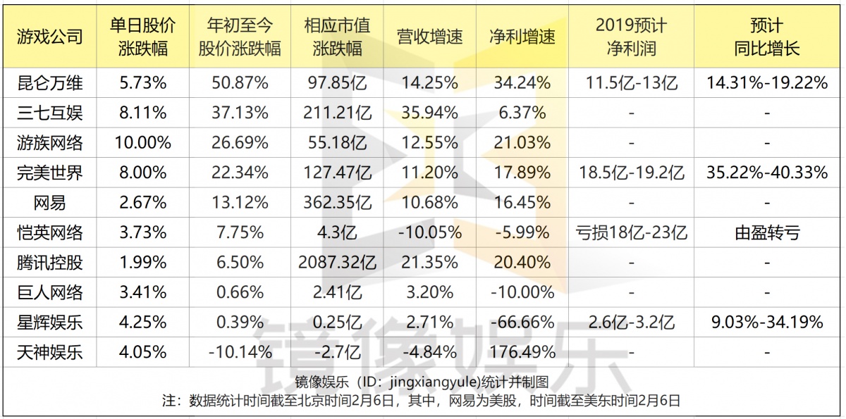 其中,除了腾讯、网易两大巨头之外,三七互娱的市值涨幅达到211亿以上,完美世界和昆仑万维的市值也增长了百亿左右,甚至是已经公布了2019年业绩预亏18亿-23亿的恺英网络,市值也在年初至今有7.75%的增长。
