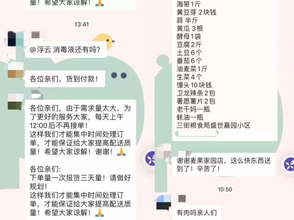在朋友的介绍下,丹丹进了由附近超市工作人员所建的微信群,群内成员若有需要可列出清单并备注自己的地址和联系方式,会有工作人员登记、采购并送货。随着消息的扩散,短短两个小时,该微信群成员在丹丹进入时的一百多人已增长至四百多人。