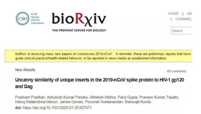 一篇来自印度理工学院德里分校研究团队的论文称,新冠病毒序列中有4条来自艾滋病毒的序列,是人工插入的。该论文是1月31日发表在生命科学领域的最大预印本(preprint即预印本,一般发布在论文正式刊载前)网站BioRxiv。