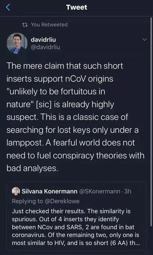哈佛大学生命科学专家刘如谦(David Liu)转发Silvana 的推文称该研究结果属于阴谋论,“这是弄丢钥匙却只在路灯下寻找的经典做派。这个世界已经足够可怕,我们不需要错误的分析来激起阴谋论。”