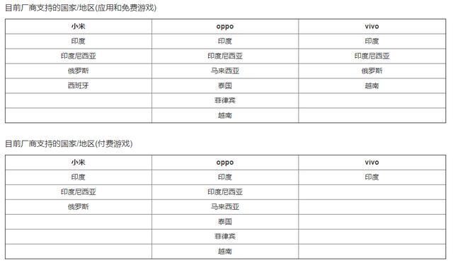 其服务目前已覆盖了印度、印度尼西亚、俄罗斯、马来西亚、泰国、菲律宾、越南、西班牙共八个国家及地区,而这八个国家正是四家手机厂商在中国以外的最大市场。现在开发者可以通过GDSA,向小米、OPPO和vivo的各地区商店发布免费和付费的应用、游戏。