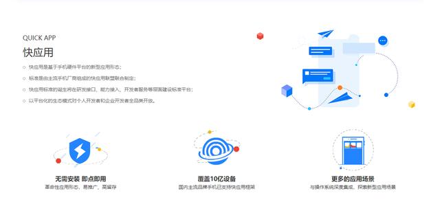 最为知名的合作莫过于快应用,这是一个吸引到小米、vivo、华为、OPPO、联想、魅族、金立、中兴、nubia、一加、海信、中国移动......几乎所有主流手机厂商的合作联盟。快应用结合了Web和Native技术,为用户提供免安装即可打开的特定应用。
