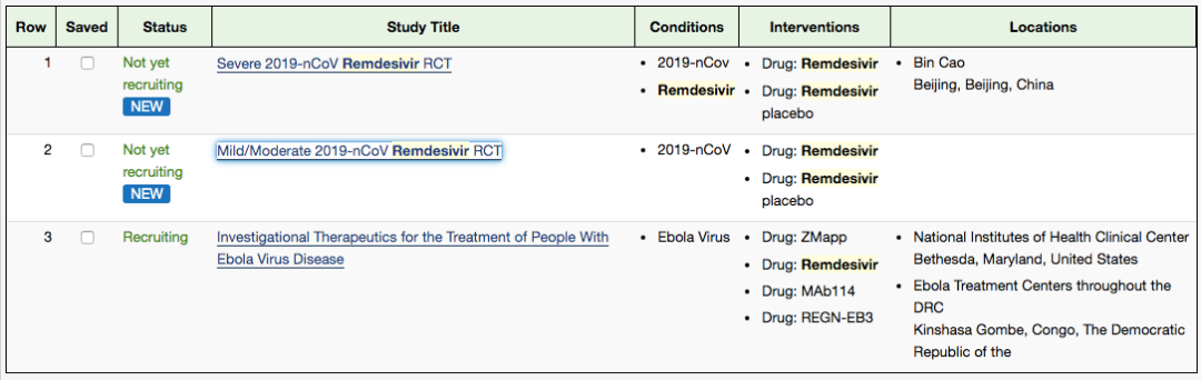 2月9日,在美国临床试验数据库官网输入关键词“Remdesivir”检索,显示有3项临床研究正在开展:一个试验为针对轻/中症新冠肺炎患者的III期RCT试验(随机对照试验),预计完成时间为4月27日;一个针对重症新冠肺炎患者的III期RCT试验,预计完成时间为5月1日。