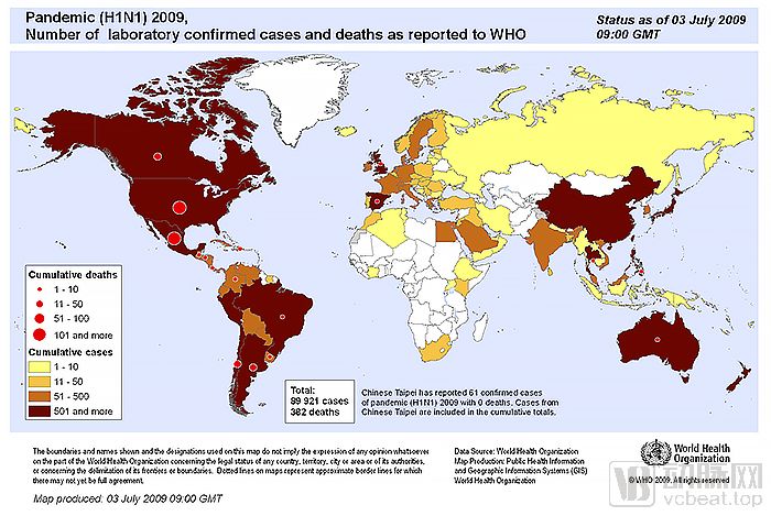 2009年H1N1病毒影响范围(图片来自WHO)
