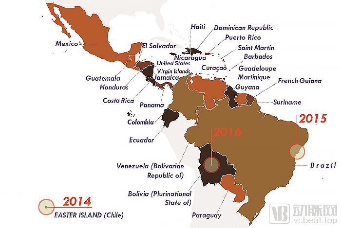 寨卡病毒影响范围(图片来自WHO)