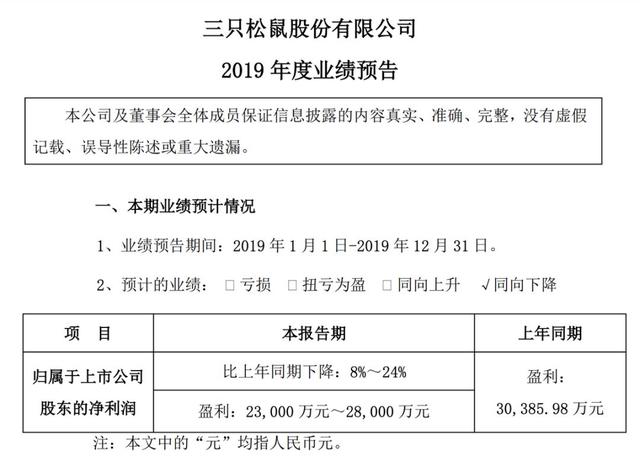 三只松鼠业绩预告显示,2019年度三只松鼠归属于上市公司股东的净利润预计在2.3亿元~2.8亿元之间,较上年同期下降8%~24%。