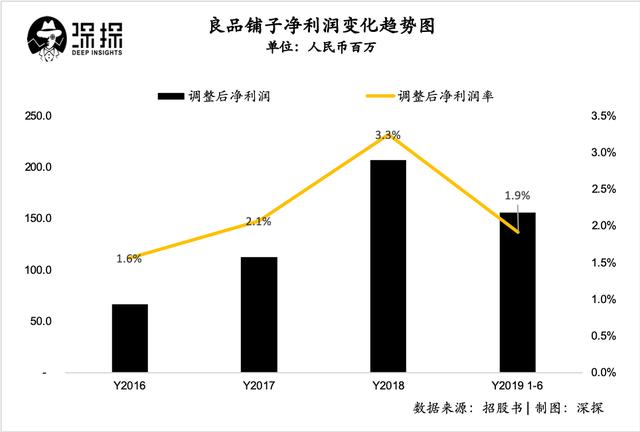 这也就导致了,良品铺子的净利润率水平也相对较低。2018年经调整后的净利润率已经是近三年最高水平,也仅有3.3%,而2019年上半年这一数据再次下降到了1.9%。