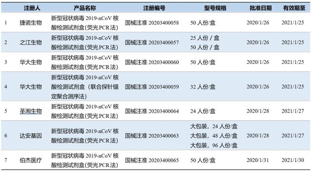 首批7个新冠病毒核酸检测试剂盒比较 数据来源: NMPA,国泰君安证券研究