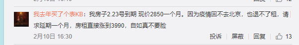 其中,反映涨价40%的微博用户为“我去年买了个表KB”,其称房子2.23号到期,现价2850元一个月。因为疫情回不去北京,也退不了租,自己请求延期一个月,结果自如房租直接涨到3990元。