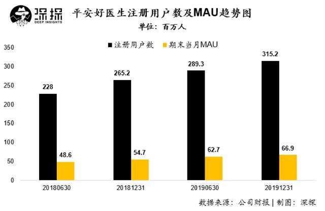 经营数据方面,平安好医生注册用户数在2019年9月份首次突破3亿后,仍保持高速增长,在2019年末达到3.15亿,较2018年底增加超5000万。其12月份月活跃用户数为6690万,高于6月份的6270万,保持较快增长。