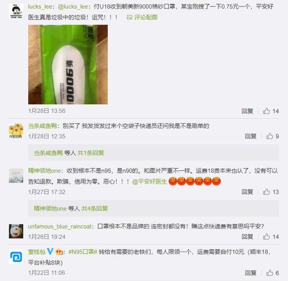 然而当各地用户陆续收到口罩时,却发现其收到的口罩并非3M或是其他品牌N95口罩,更多的是一次性普通口罩。因此,很多消费者聚集到平安好医生官微下留言反映并要求退款。同时,很多人也认为平安好医生本次口罩赠送活动更多的是一项“噱头”营销活动,而非公益之举。