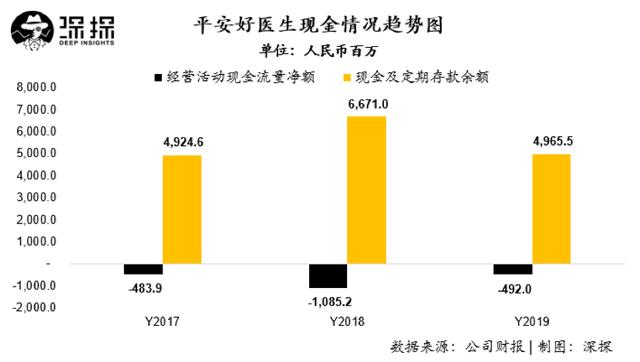 在现金流方面,平安好医生2019年经营活动现金净流量仍然为负,但在绝对金额上与上一年相比已显著收窄,仅为4.92亿元人民币。