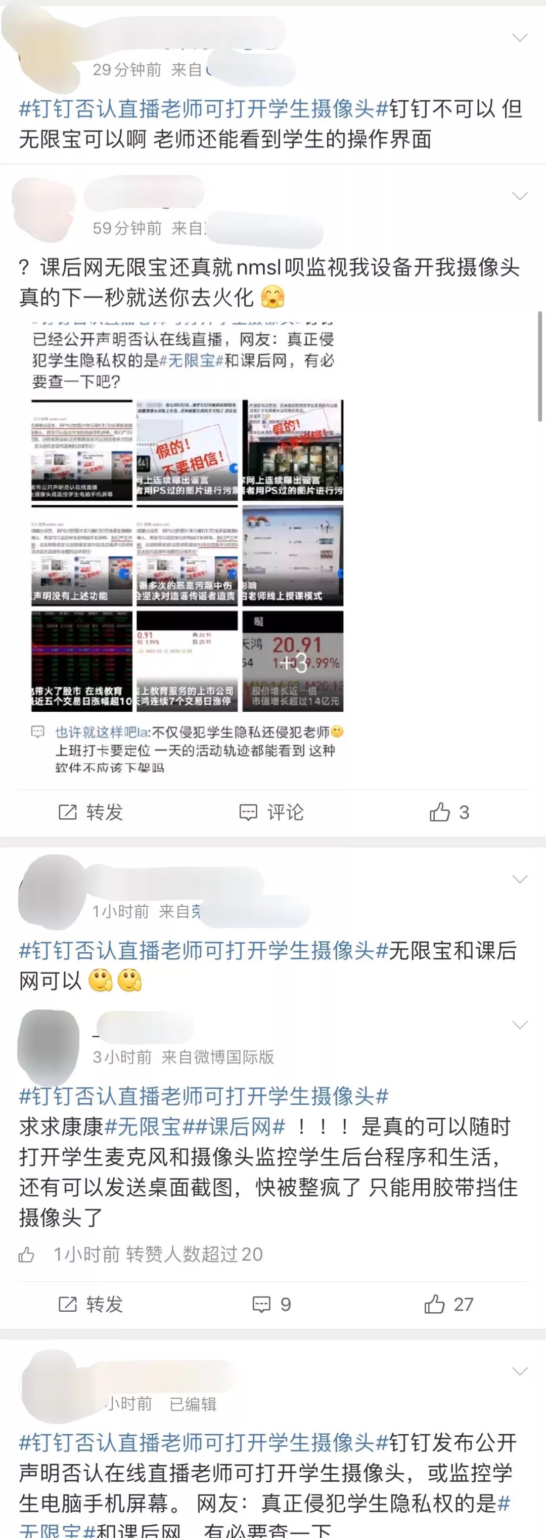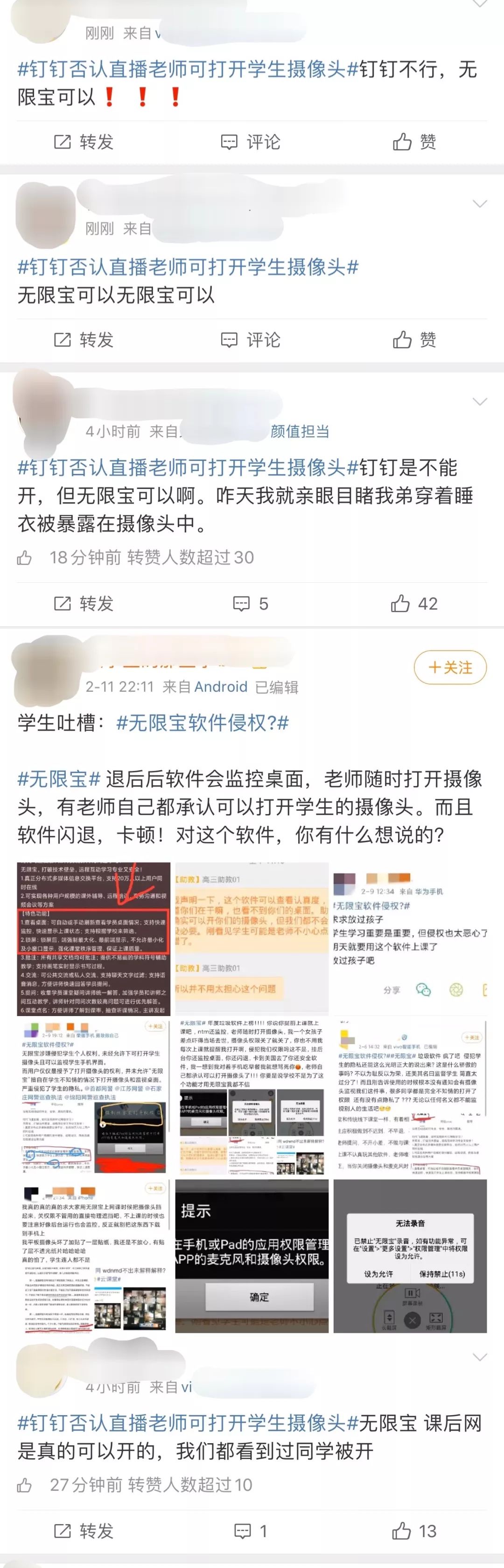 不过,虽然钉钉辟谣了相关传闻,但却有大批网友反映称课后网、无限宝两款软件的确存在老师可以在学生不知情情况下打开学生手机摄像头查看学生状态的问题。