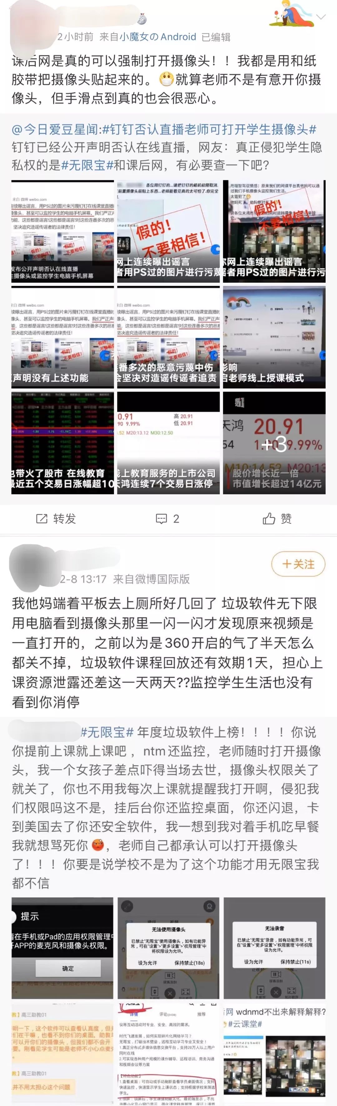 除了网传的监控界面,有大批网友在社交平台中曝光课后网、无限宝两款软件严重侵犯个人隐私。