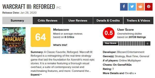这些举动很快让《魔兽争霸3重制版》成为了Metacritic所收录的9726款游戏中,位列倒数第一的存在。