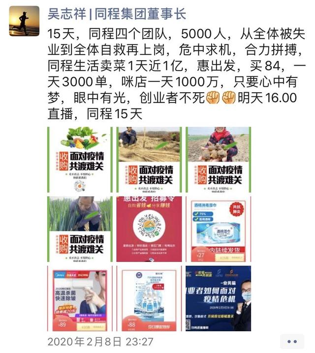 吴志祥介绍到,“我们用了一天时间给1000多名旅游销售人员做了培训,与同程生活跟咪店达成合作,大家今天看我们同程旅游顾问的朋友圈,要么是在卖菜,要么是在卖84消毒液等等,这没有什么不好意思,活着就是最大的自尊。”