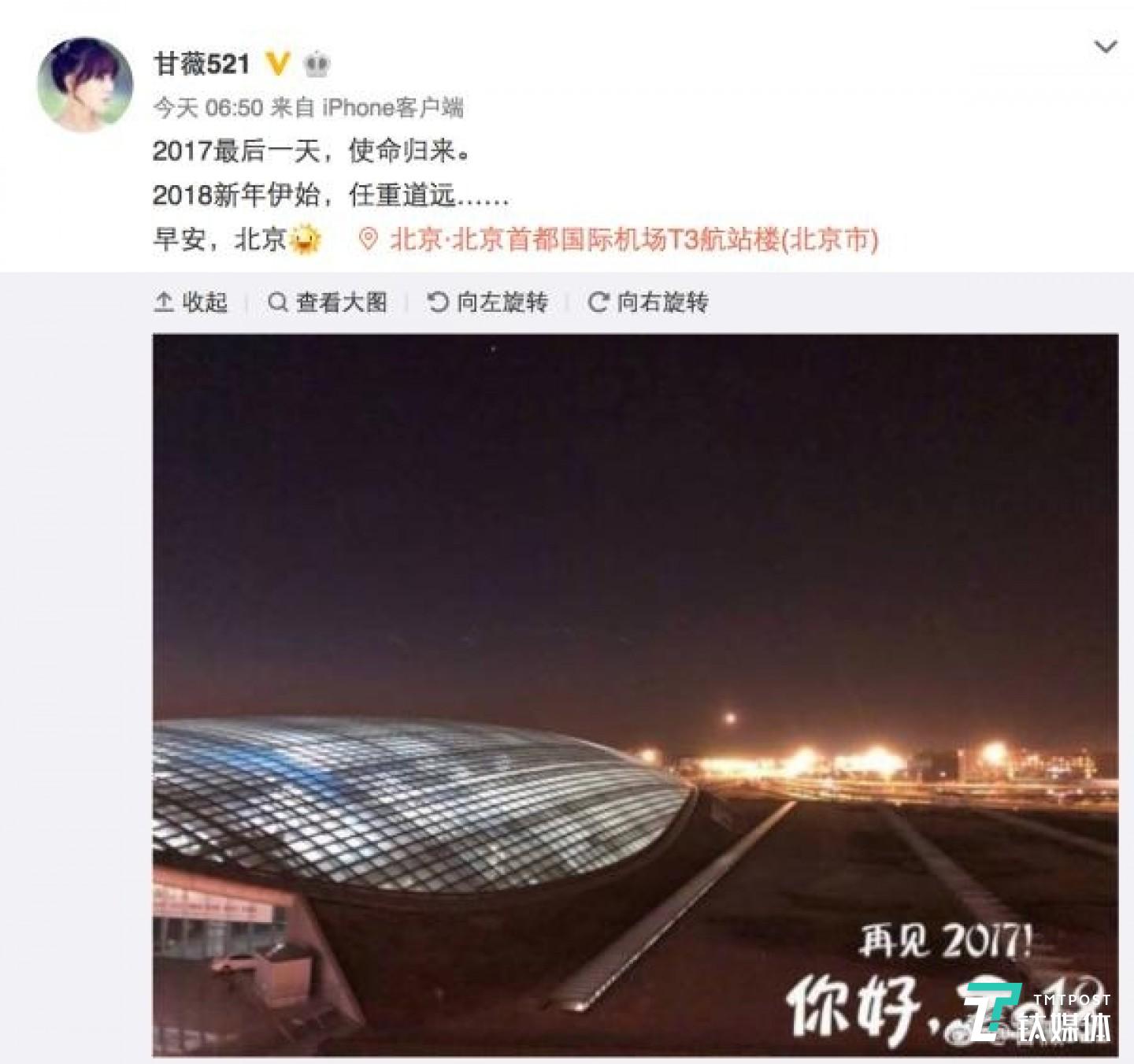 2017年12月31日清晨,甘薇在美国与贾跃亭分别,独自乘坐航班降落在北京首都国际机场,落地之时,她用手机拍下T3航站楼的照片,附带坐标发到了她个人微博上,称自己带着使命归来。