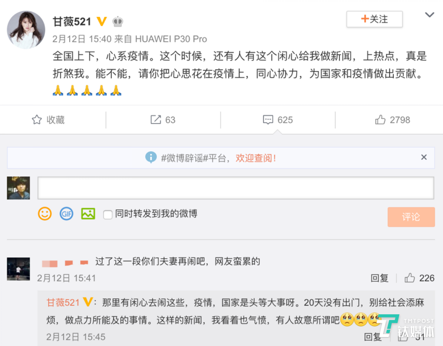 下午,甘薇发出一条微博,疑似作出回应,称有人给她做新闻上热点,“真是折煞我”。她在回复网友评论时表示,自己已经20天没有出门,近来一直关注着疫情,孩子们主动提出把压岁钱都全部捐出来,支援灾区。