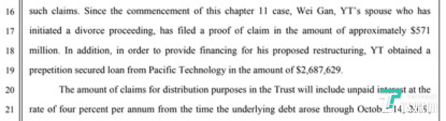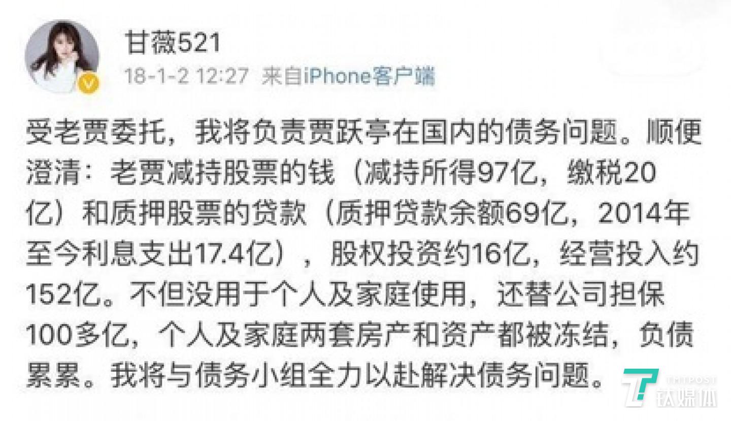 钛媒体注意到,此次甘薇索偿的5.7亿美元,占其资产的40.22%。按照婚姻法对夫妻债务的规定,几百亿的债务既不是用于家庭生活,也不是夫妻共同经营导致,所以甘薇大概率不用“替夫还债”。