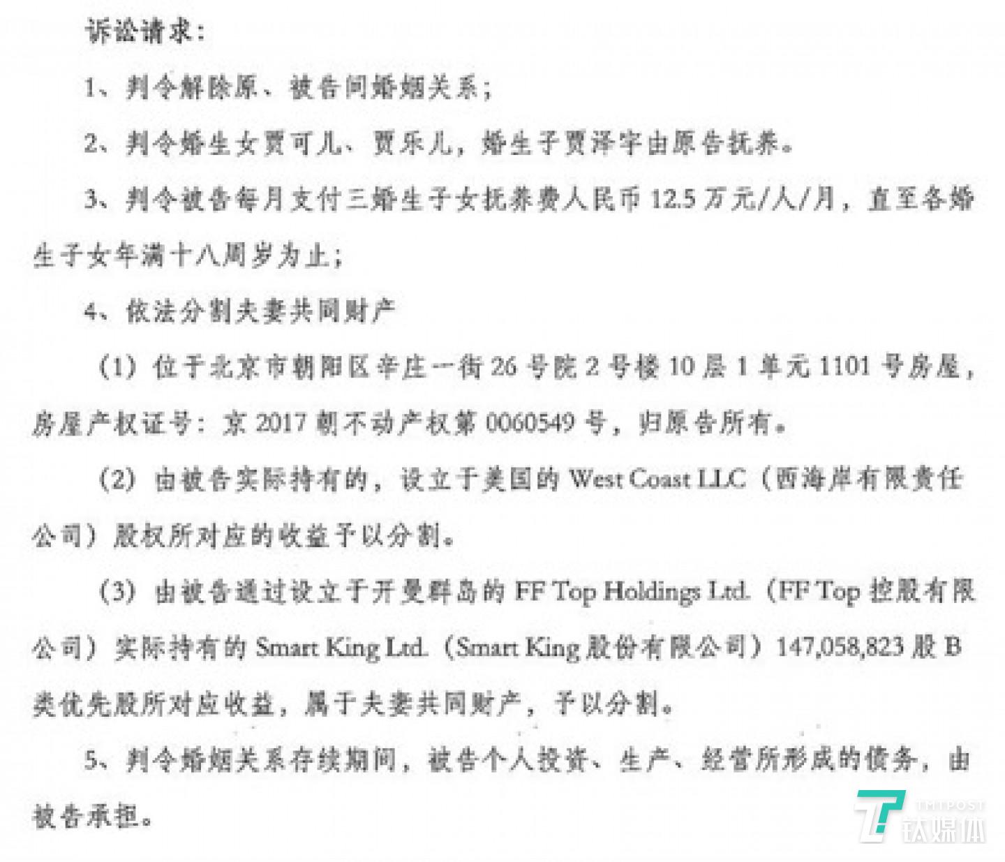 在分割夫妻财产方面,甘薇要求:北京市朝阳区辛庄一街一套房产归其所有,同时获得由贾跃亭实际持有的美国West Coast LLC公司股权所对应的收益、贾跃亭通过FF Top控股有限公司实际持有的Smart King股份有限公司1.47亿股B类优先股所对应收益。