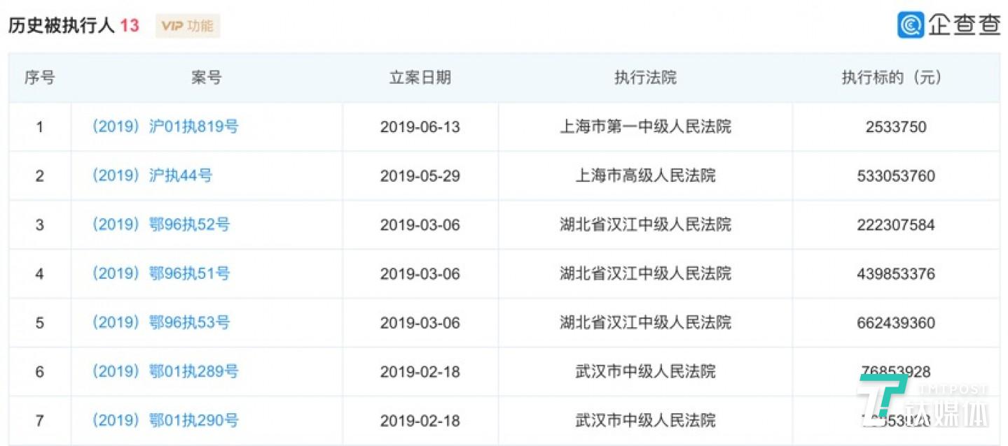 早在2018年,甘薇就曾因未支付欠款,被法院列为失信人,也就是俗称的“老赖”。企查查数据显示,甘薇方面历史被执行人信息共有13条,其中执行标的达到47.48亿元。