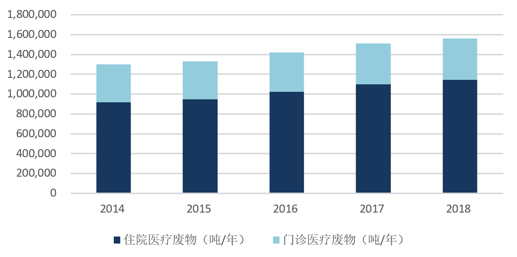 截至2018年,200个大、中城市医疗废物产生量81.7万吨,处置量81.6万吨,全国主要大中城市医疗废物处置率99.9%,基本已全部得到妥善处置。