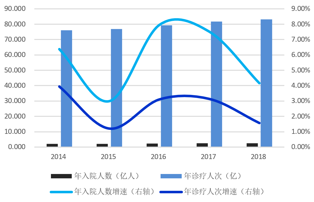 ▼2014-2018全国住院和门诊人数及增速
