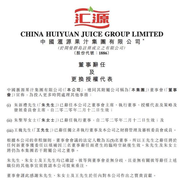 2月12日,曾经的国民饮料品牌汇源果汁发布公告表示,汇源集团创始人、原中国汇源果汁董事会主席、执行董事朱新礼辞任辞任,执行董事鞠新艳出任新董事会主席。