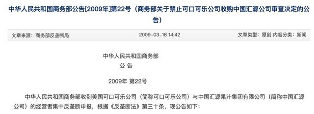 国民果汁品牌卖身的敏感性在舆论中引起了轩然大波,遭到了多个层面的反对。2009年3月,商务部依据《反垄断法》叫停了这项收购案,汇源“卖身”可口可乐最后以失败告终。