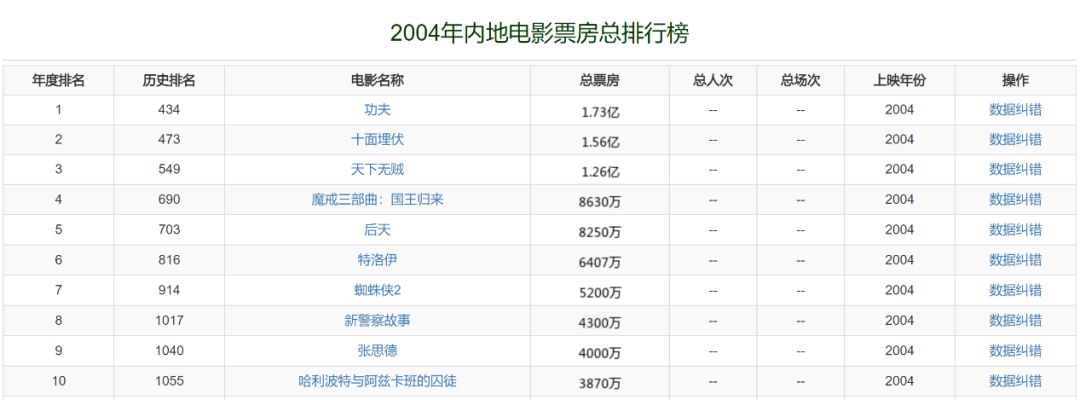 但受政策鼓励,2004年电影市场迎来暴发式增长,国产片总产量较2003年的140部提升了51%,《功夫》《十面埋伏》《天下无贼》三部电影总票房均超过1亿元。