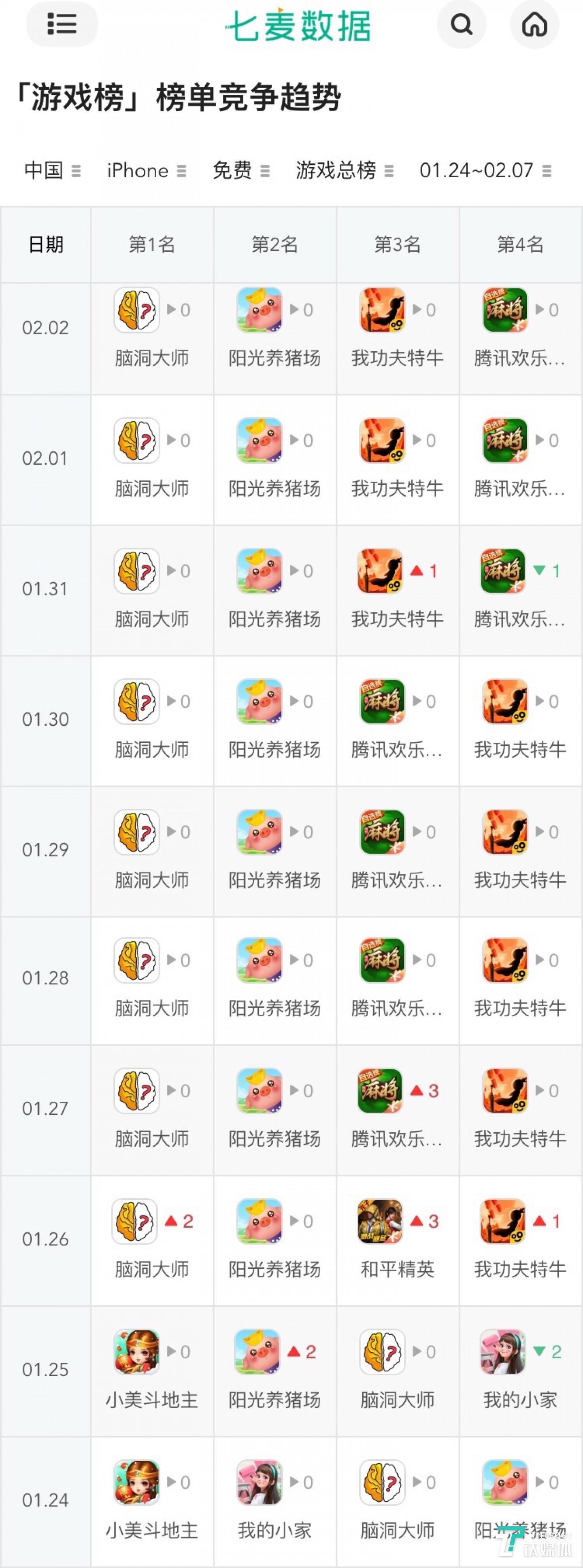 七麦数据中,APP Store免费榜的TOP10与畅销榜形成了有趣的对比——棋牌解谜超休闲游戏为主,小厂商乘着字节跳动的流量才榜上有名,游戏操作难度都只能由腾讯的《王者荣耀》和《和平精英》撑起来。