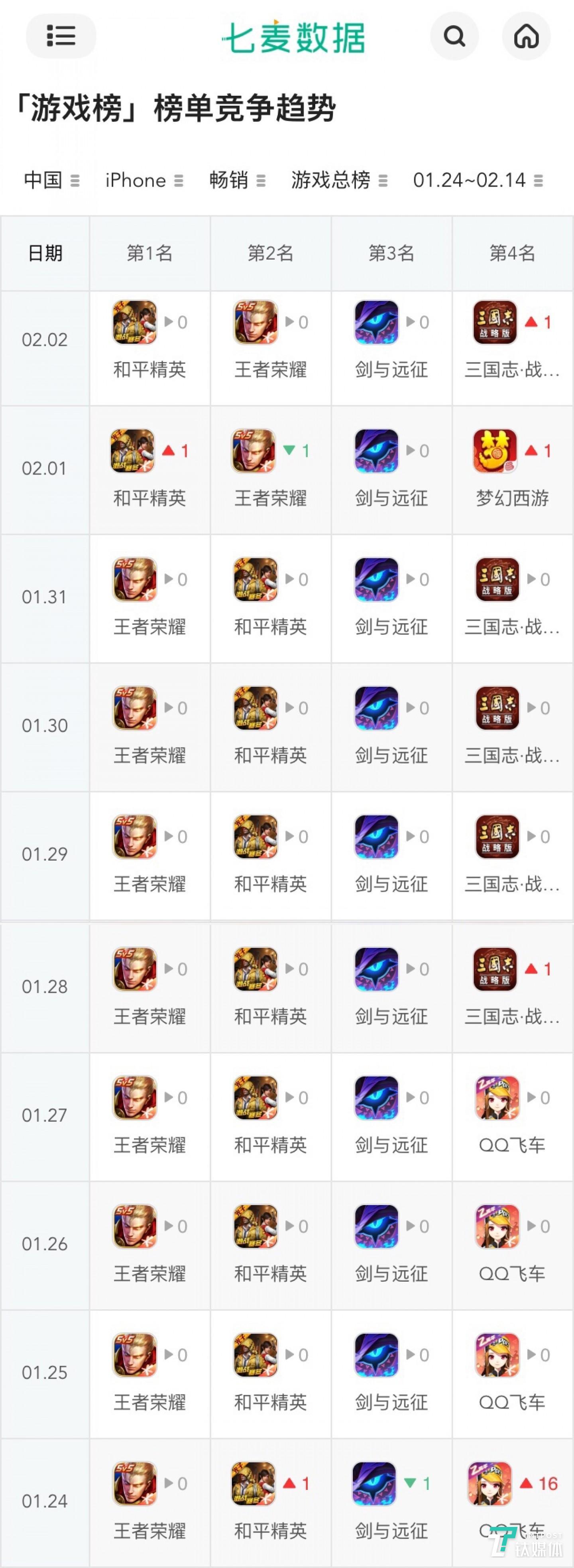 七麦数据的结果与榜单略有出入,但相似的是,网易与腾讯的游戏都把控着TOP10中的大多数位置。点开七麦数据的中国 App Store 畅销榜,腾讯的《王者荣耀》、《和平精英》,网易的《阴阳师》与莉莉丝的《剑与远征》轮流占据着TOP3。